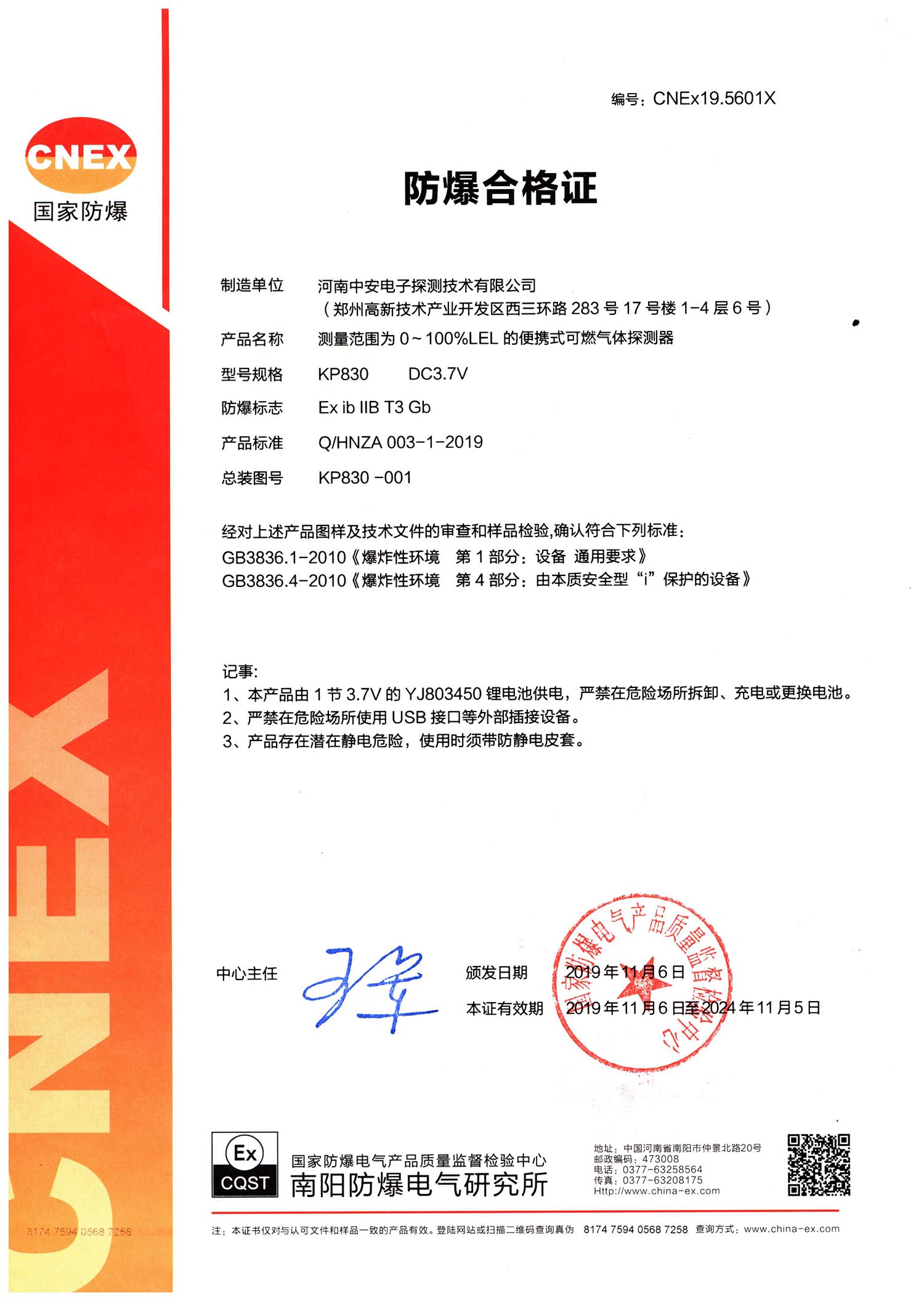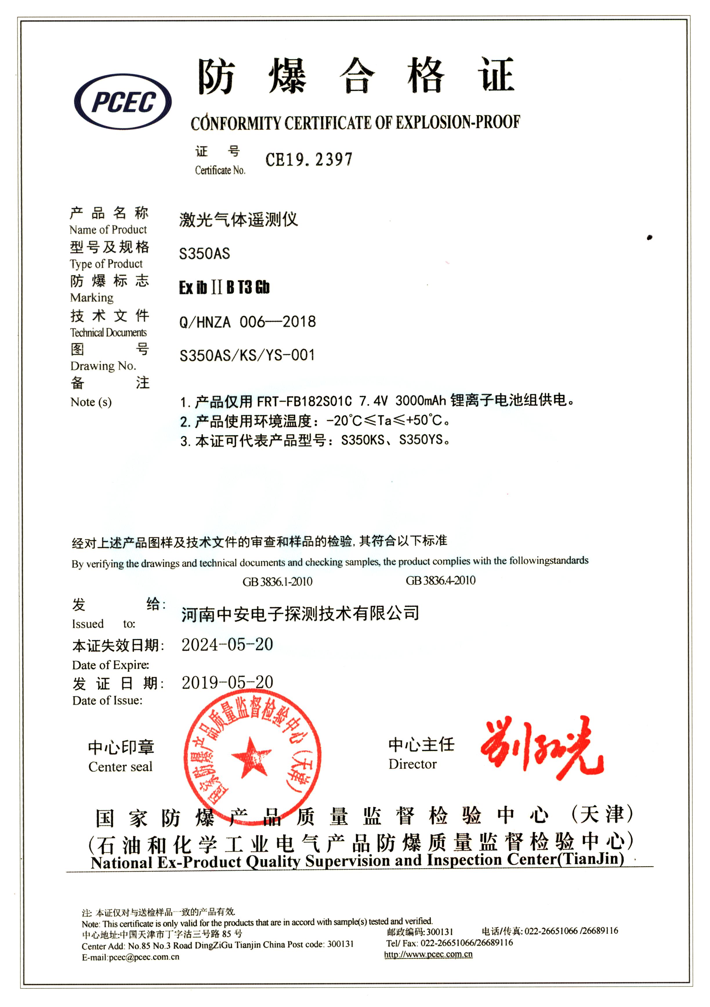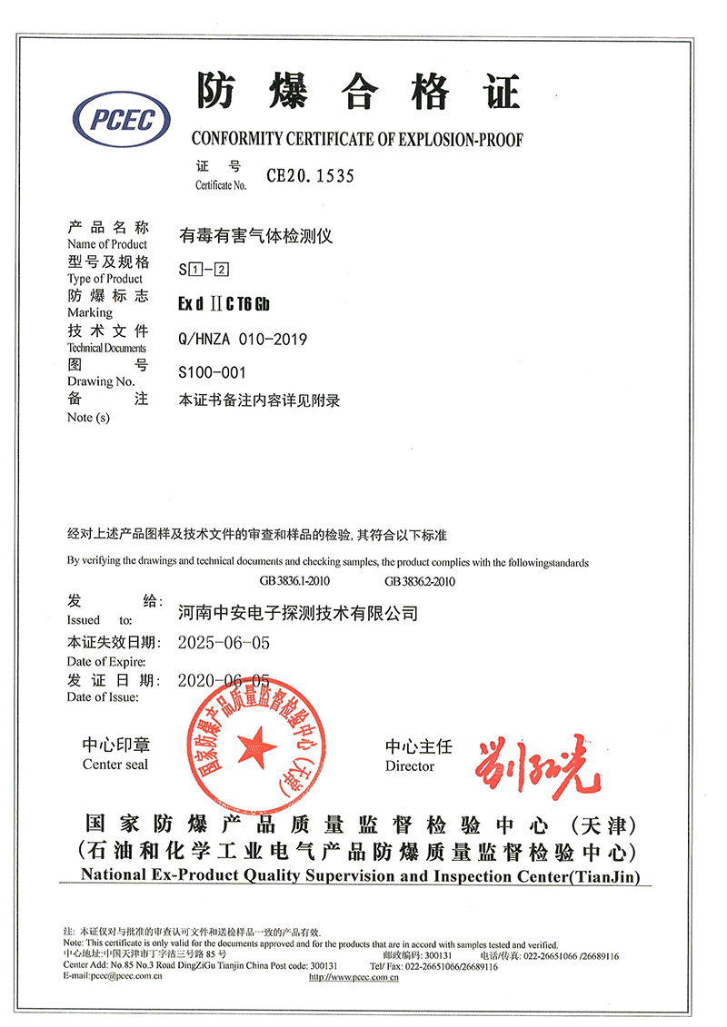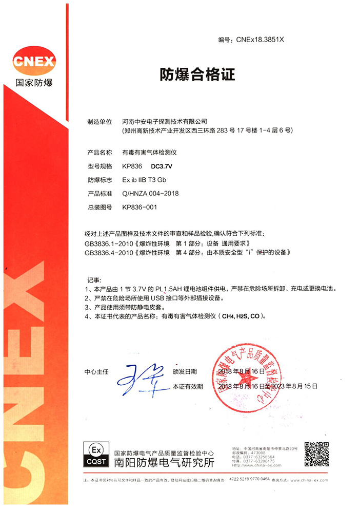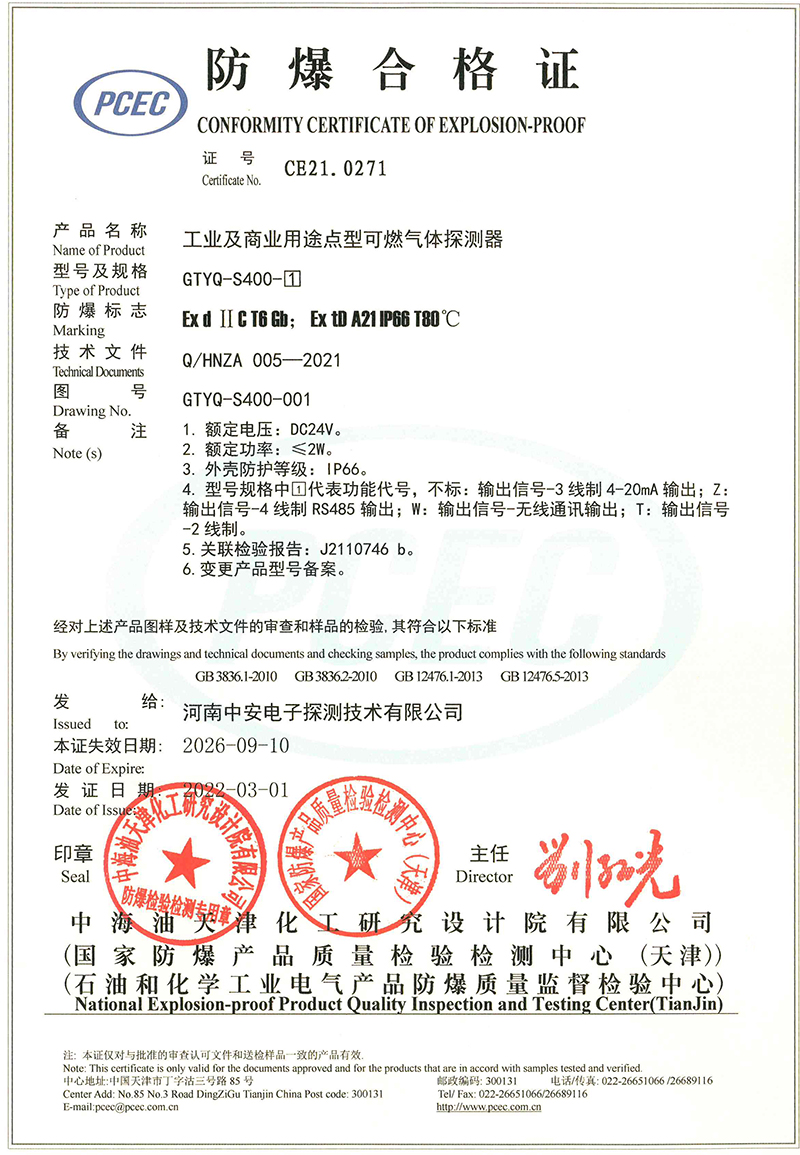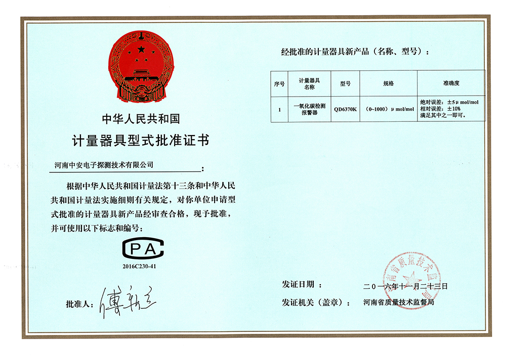 中安探測產(chǎn)品的立項(xiàng)、設(shè)計(jì)、研發(fā)符合市場需求、符合國家產(chǎn)品質(zhì)量技術(shù)要求,儀表設(shè)計(jì)精美,檢測數(shù)據(jù)準(zhǔn)確穩(wěn)定,氣體探測傳感器及便攜式檢測傳感儀表均為防爆型設(shè)計(jì),質(zhì)量穩(wěn)定的產(chǎn)品先后取得國家計(jì)量器具型式批準(zhǔn)證書、國家防爆電氣產(chǎn)品合格證、國家防爆電氣設(shè)備安裝修理資格證、CCCF消防產(chǎn)品認(rèn)證證書、國家礦用產(chǎn)品安全標(biāo)志證書、國家環(huán)保產(chǎn)品證書、計(jì)算機(jī)軟件著作版權(quán)及實(shí)用型專利證書、外觀專利證書、商標(biāo)等證書。